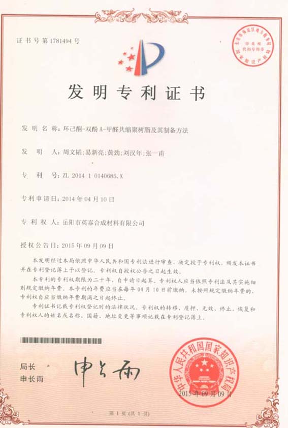專利一:環(huán)己酮-雙酚A-甲醛共縮聚樹脂及其制備方法